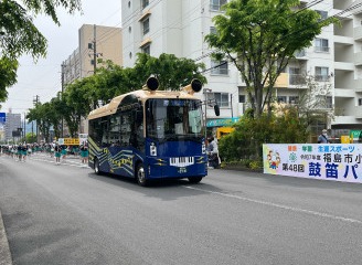 青いメロディーバスが先導する中、各校からの代表児童が演奏します。沿道からの応援をよろしくお願いいたします。