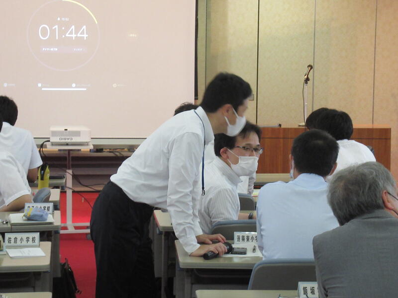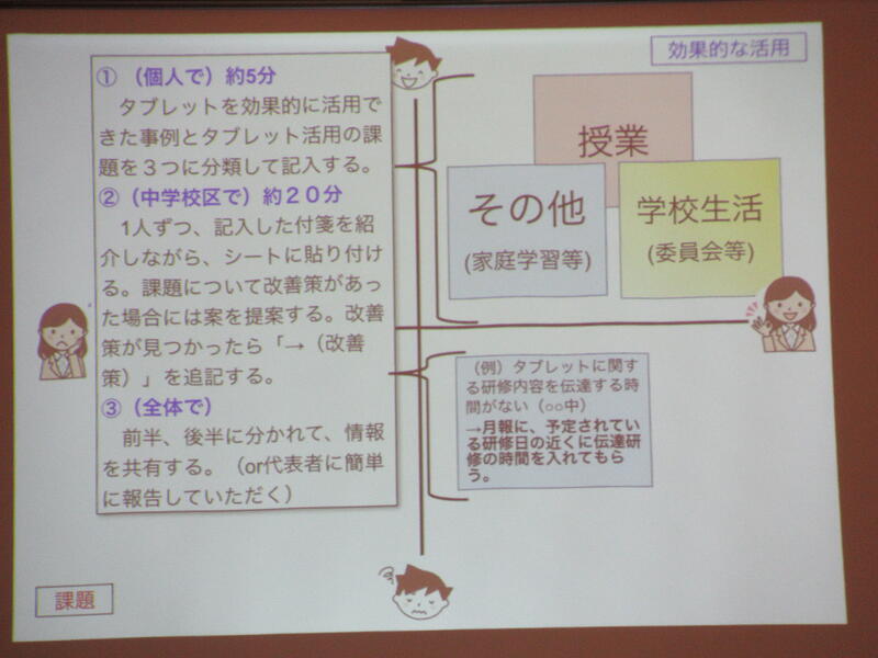 研修会では,「FCSの活用の仕方について」の説明及び「タブレット端末を活用した教育推進に向けて」の講義、「タブレット端末の活用における校内の課題の解決に向けて」の協議を行いました。特に、協議では、中学校区ごとに話し合いを行い、効果があった取組や課題について共有することができました。