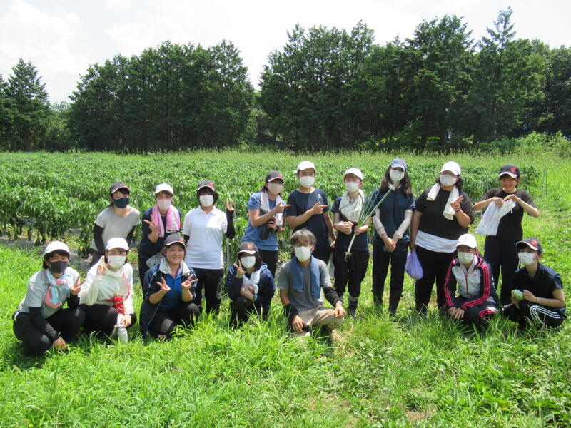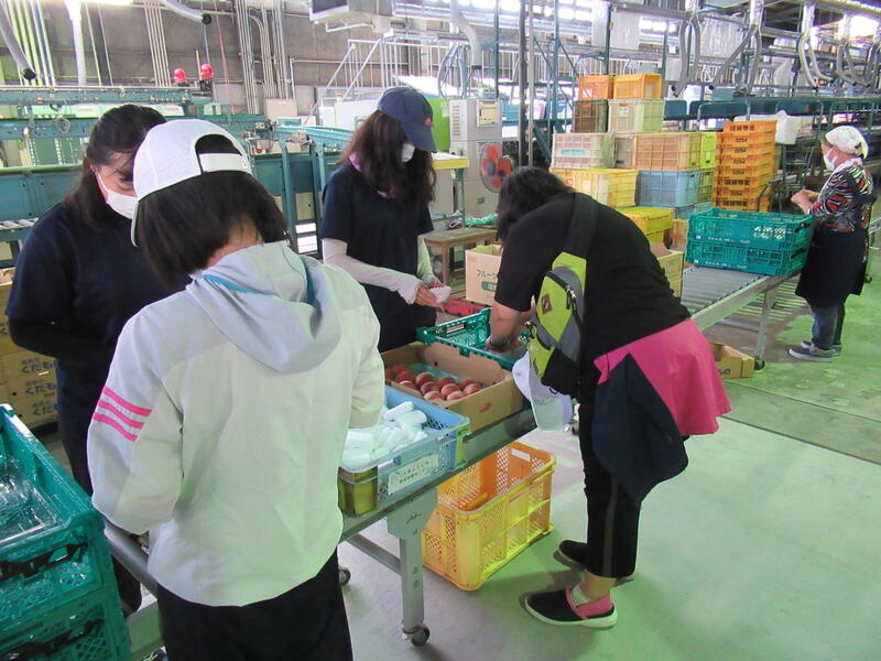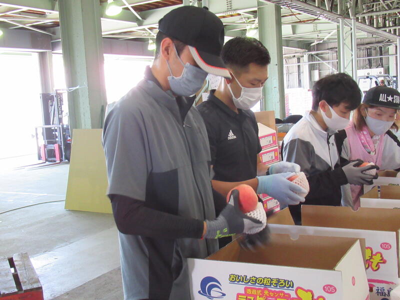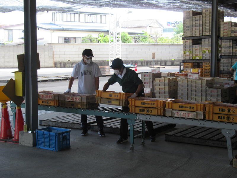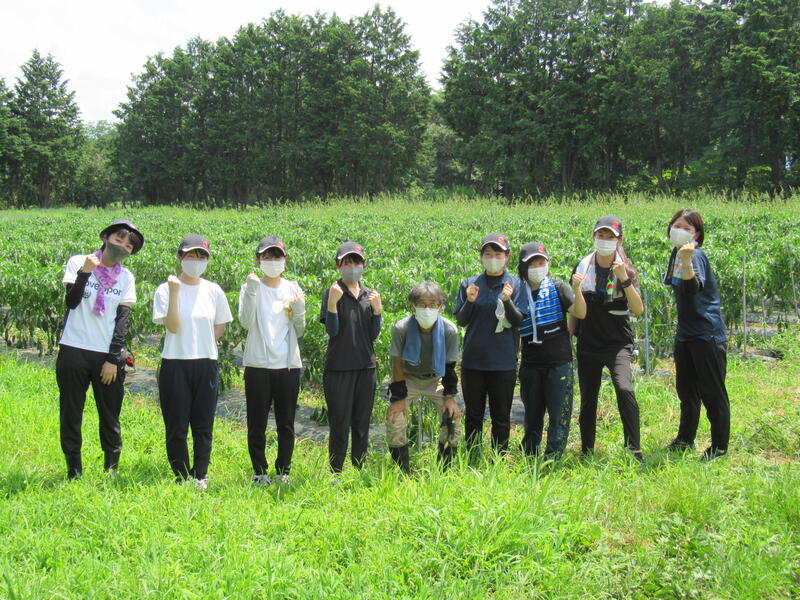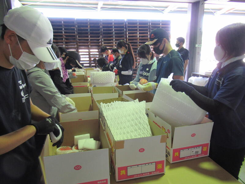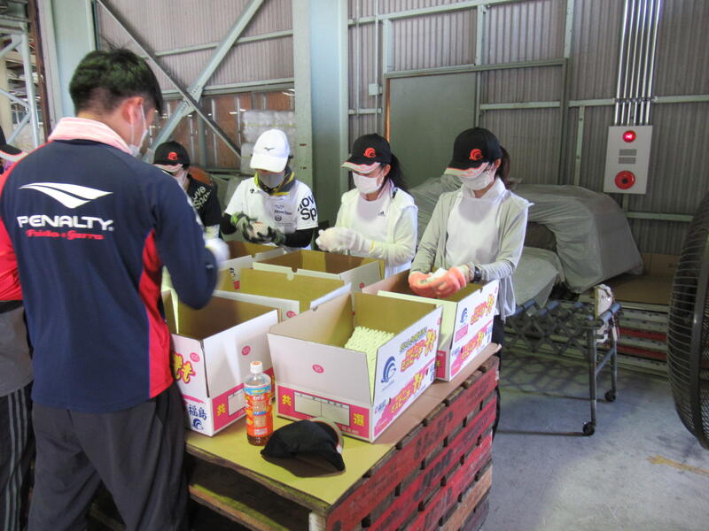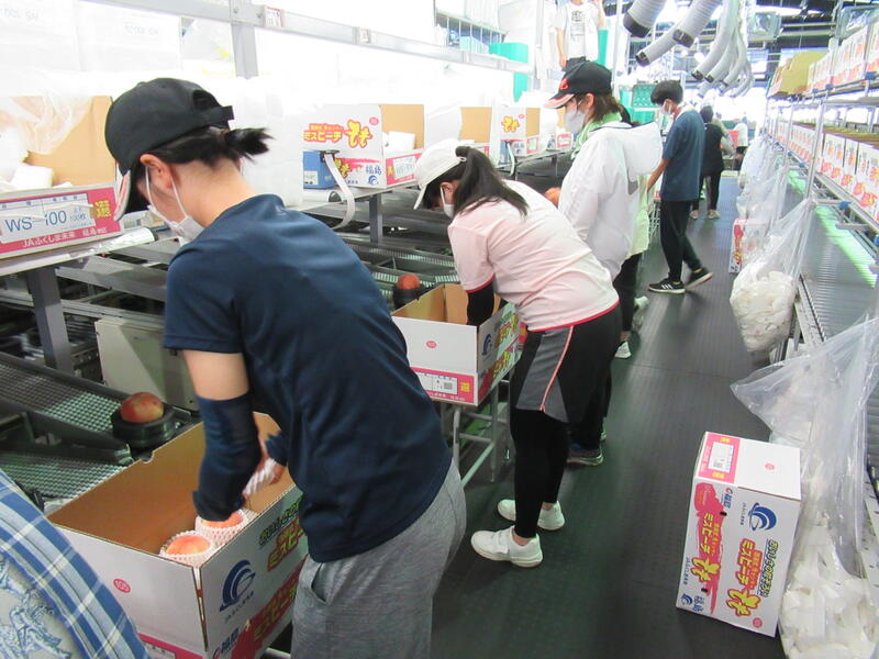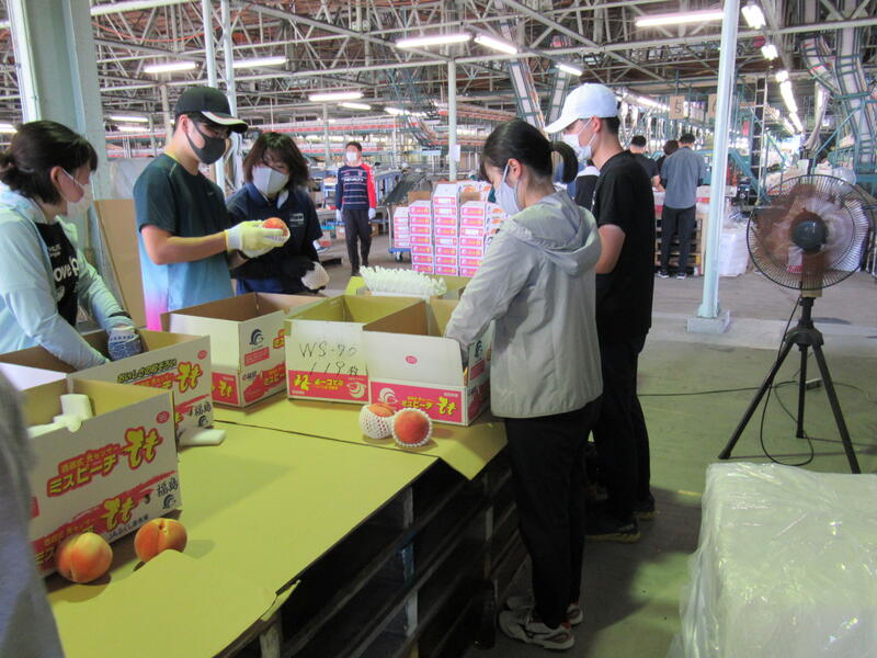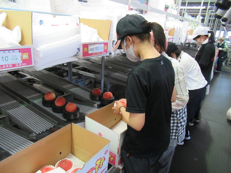 8月5日は「新ふくしまファーム」での農作業体験実習を、6日は「湯野共選場」と「野田共選場」に分かれ、桃の選果作業等の体験実習を行いました。いずれも、ふくしま未来農業協同組合様にご指導をいただきながら研修を行いました。