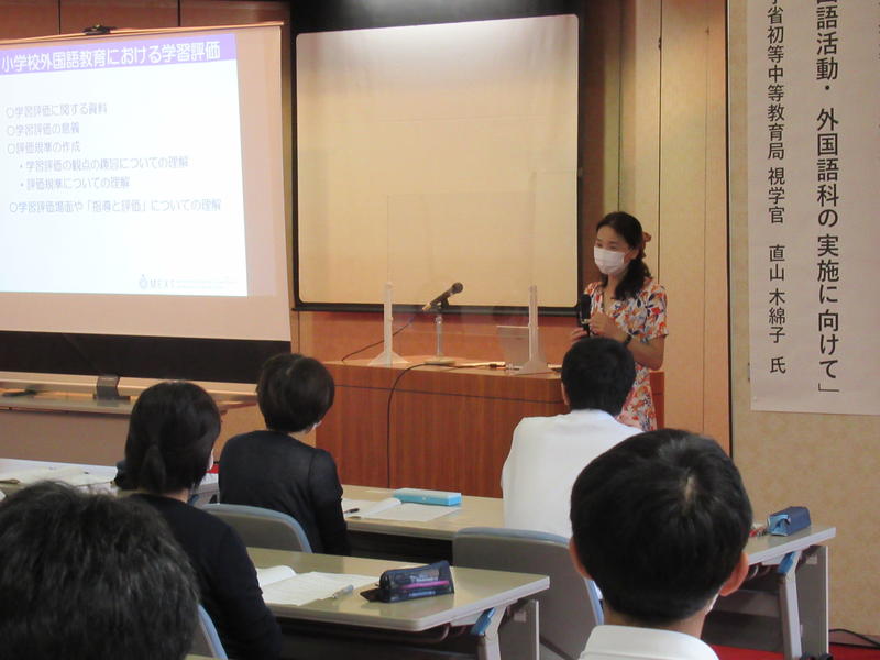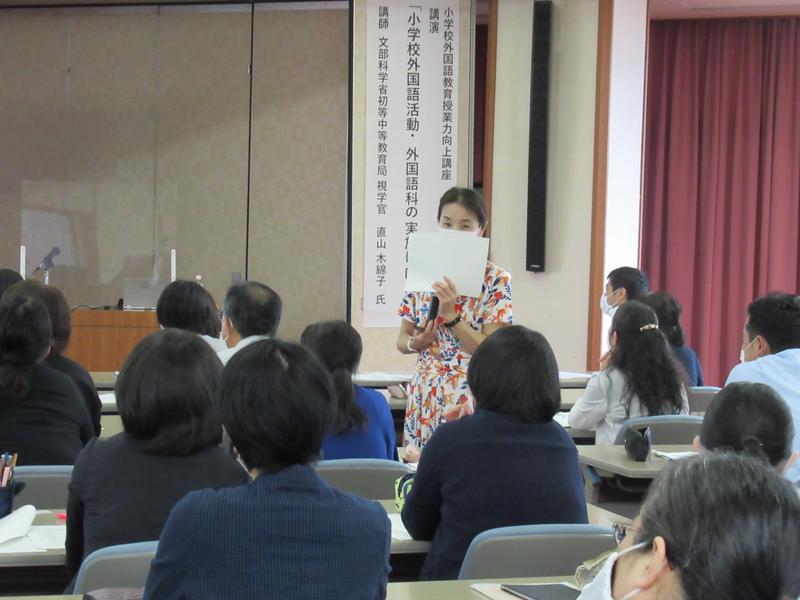 7月14日に文部科学省初等中等教育局視学官の直山木綿子氏をお招きして、小学校外国語教育授業力向上講座を行いました。小学校における「外国語活動・外国語科」の実施に伴い、評価の捉え方や方法、評価するための授業構想等について、学習指導要領に基づいたより具体的なお話を伺うことができました。
