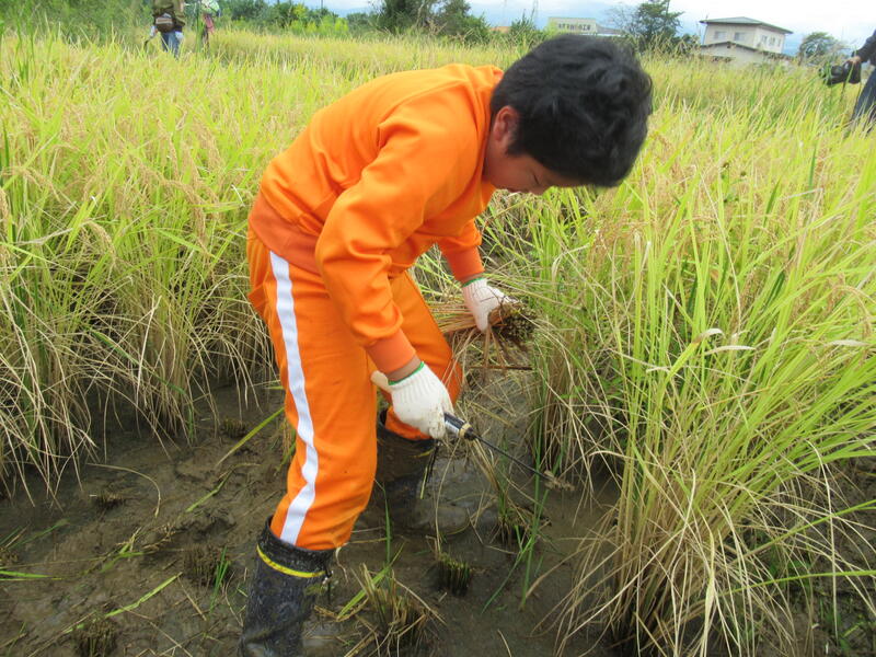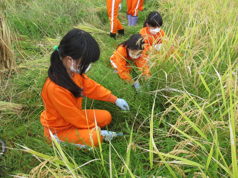 安全な稲の刈り方、刈り取った稲の束ね方を教わりました。