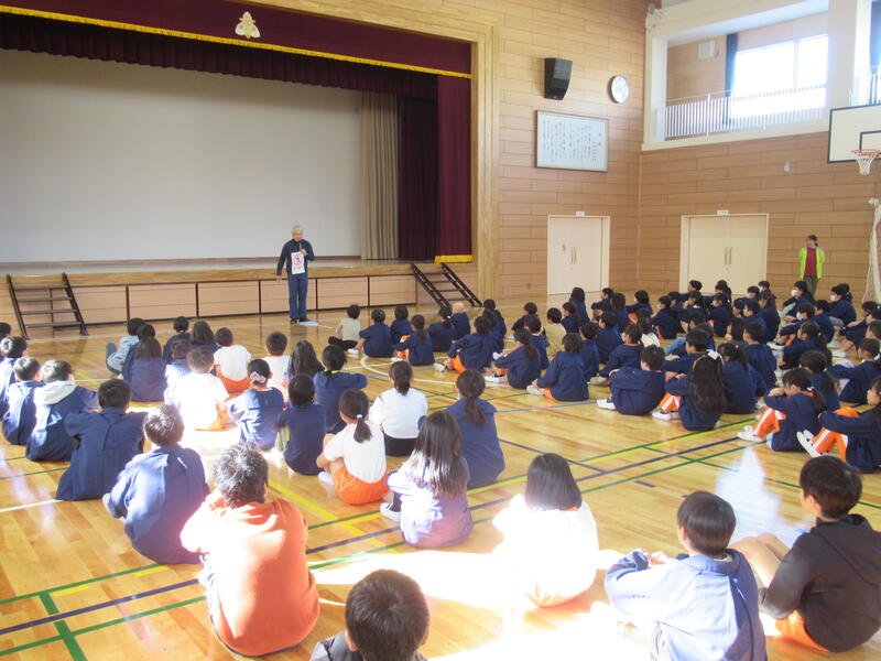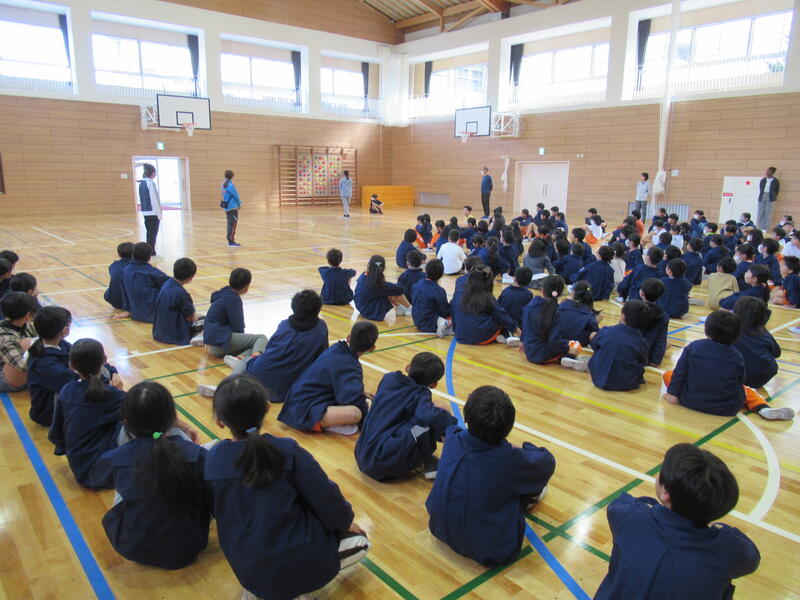 本日、朝の集会で子どもたちに新体育館の使い方について説明しました。