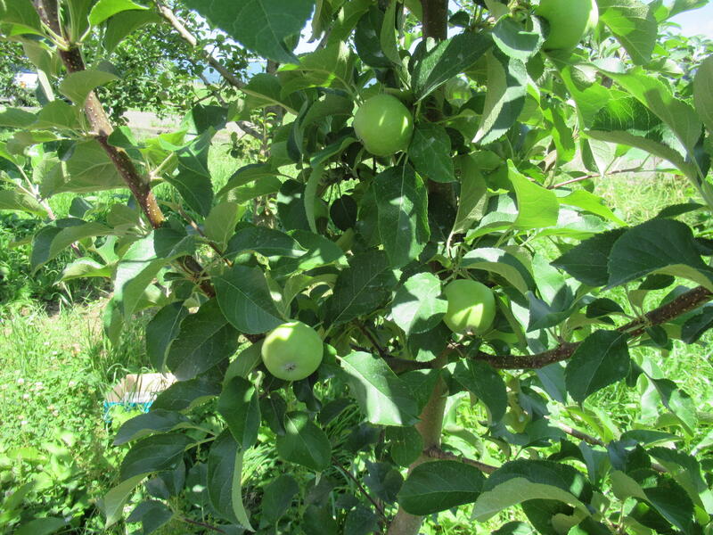 青い小さなリンゴの実がなっており、摘果についても教わりました。