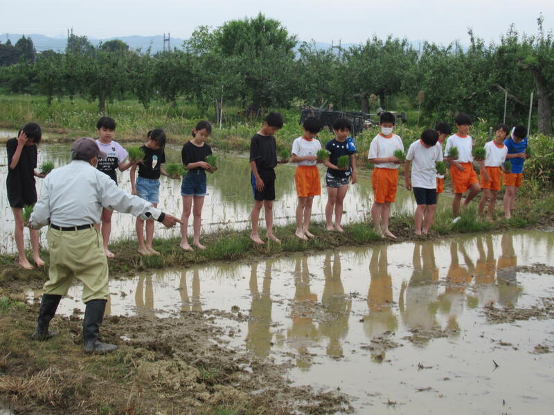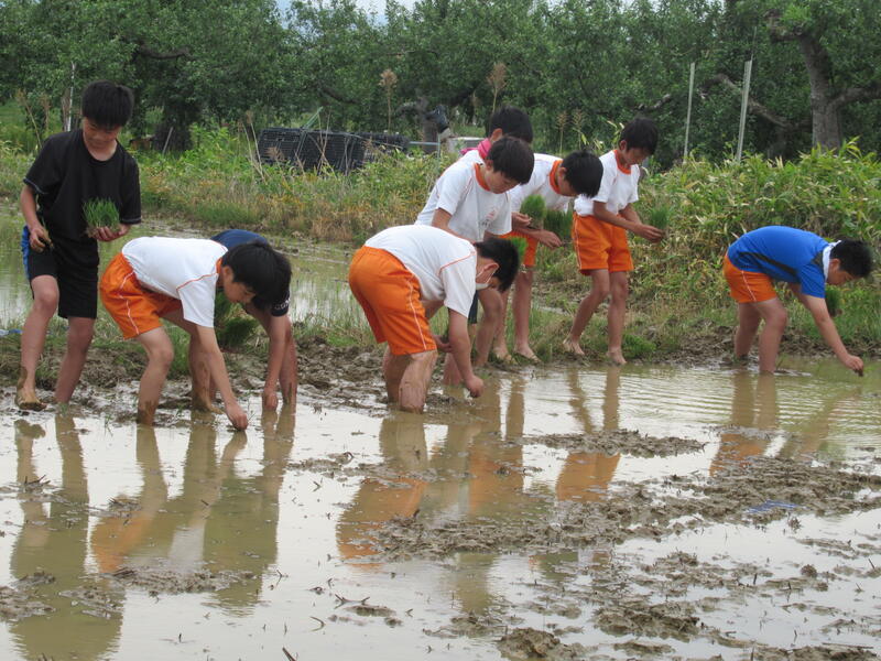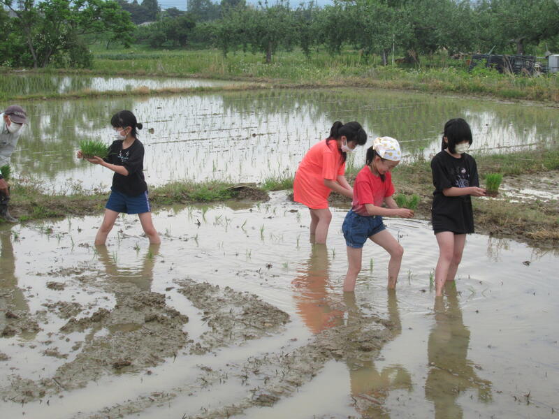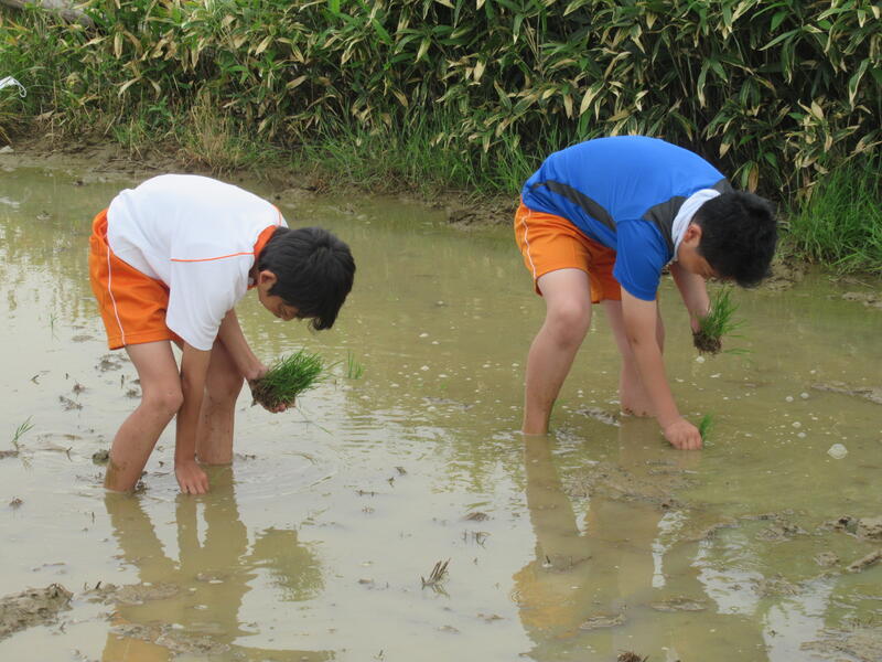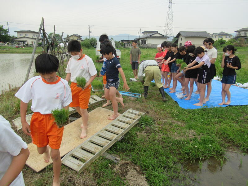本日、総合的な学習の時間で、5年生が田植えをしました。
