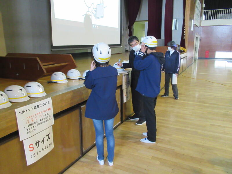 自転車通学の児童は、ヘルメットのサイズ合わせをしました。