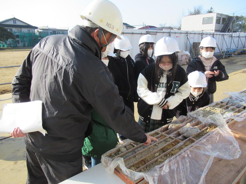 地中のボーリング調査をした土壌サンプルを見せていただいたり、