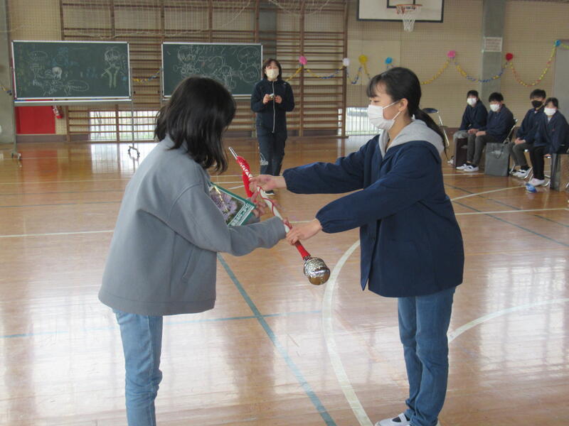 6年生の加藤新菜さんから5年生の遠藤柚瑠さんに指揮杖が渡されました。