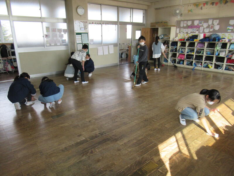 2022年3月14日 16時12分本日、愛校清掃として学級ごとに教室の水拭き、ワックス塗りを行いました。
