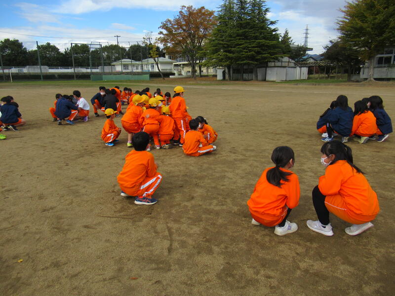 校庭にいた子どもたちは、まとまってしゃがんでいました。