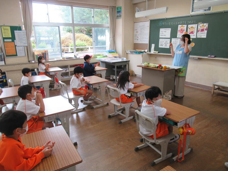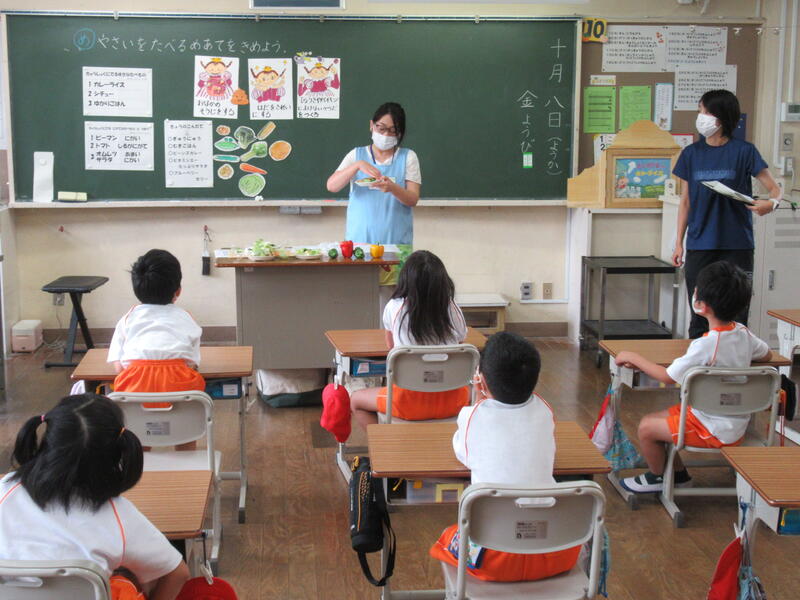 北部給食センターの佐藤啓子先生から、好き嫌いをせず野菜と食べることの大切さについてお話をいただきました。