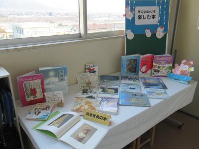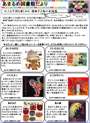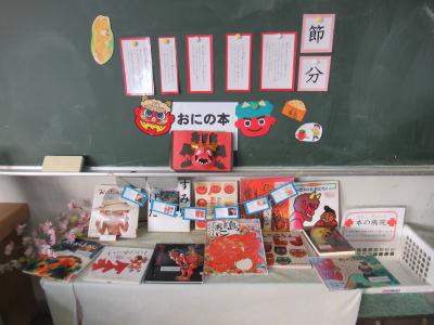 ↑ 図書室には「鬼」の本、図書室前には「冬のおわり」を楽しむ本を飾っています。