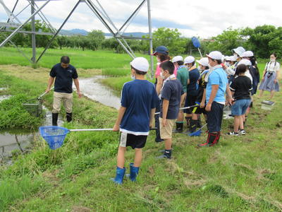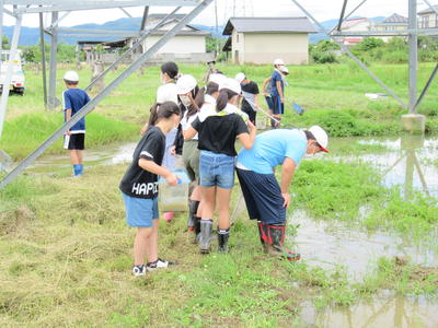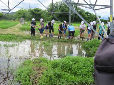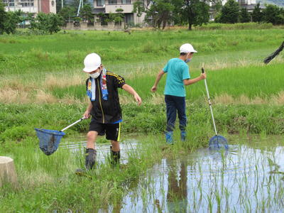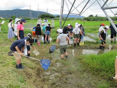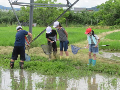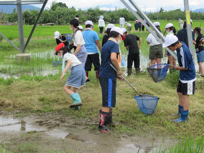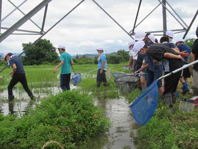 早速子どもたちは学校田へ向かい、田んぼや水路、水たまりなどにどんな生き物が棲んでいるか、網で捕獲作戦を実施しました。