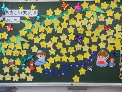 写真のように、全校児童143人と先生方が、星の形をした短冊に願いを込めて、黒板に大きなあまの川をつくりました。
