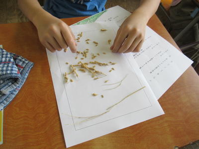 Tさんは農業の中でも稲作が本業です!子どもたち一人一人に昨年実った稲穂を持ってきてくださり、子どもたちは一粒の種もみからどのくらいの米が実るか数えました。