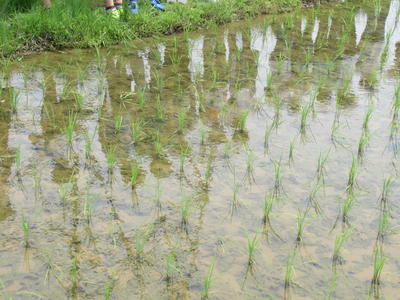 その後実際に田んぼへ向かい、残念ながら今年はできませんでしたが、Tさんに植えていただいた苗の成長の様子を観察しました。