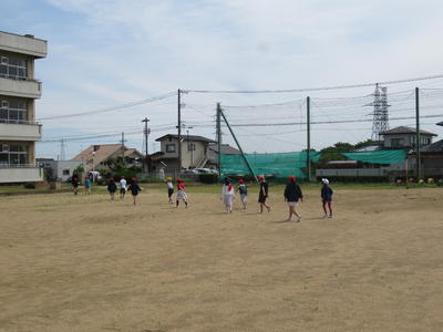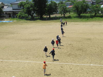 体育主任のO先生が校庭に1周150mのトラックを描きました。(真ん中の写真にラインがちょっと写っています。)