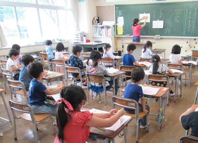 ↑ 1年生は姿勢をよくして「しょしゃ」のおべんきょう。