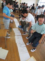 その後、夏休み中に行われた市の水泳大会で入賞した5人と、男女それぞれのメドレーリレーの選手に賞状を伝達しました。おしくも入賞には手が届かなかった選手も自己ベストを更新するなど、よくがんばりました。また、1学期に参加した習字のたなばた展で特選に入賞した7名の賞状伝達を行いました。