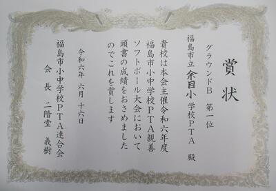 日曜日に行われた福島市小中学校PTA親善ソフトボール大会で、余目チームが、グラウンドBで見事、第一位となりました。昨日の夕方、表彰状が、学校に届けられました。どの試合も、すごかったのですが、特に最後の決勝戦は、圧勝だったそうです。おめでとうございます。