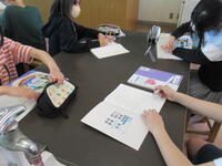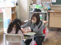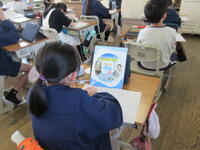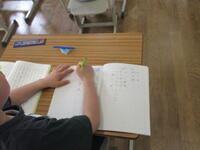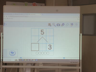 1年生の教室では、算数の学習が行われていました。5は、3と「?」かな。考えて、答えの数だけ色を塗ります。3と何かな?
