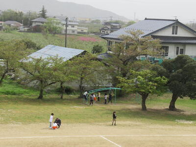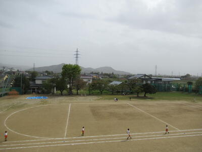 2024年4月18日 18時10分広くてきれいな余目小学校の校庭です。5校時目、体育科では50m走、理科では校庭の植物の観察などが行われていました。