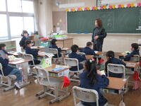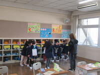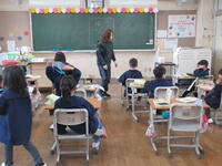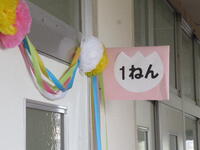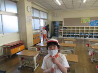 1年生教室では。国語科「よろしくね」の授業でした。自己紹介カードをかいて、首に下げ、自分のことを言葉で紹介します。「わたしは、〇〇 〇〇です。〇〇が すきです。」「ぼくのなまえは、〇〇 〇〇です。〇〇がだいすきです。」何人に紹介することができたかな?
