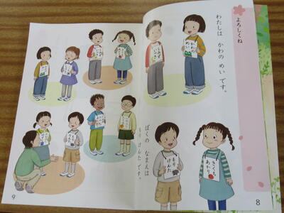 2024年4月11日 18時15分1年生教室では。国語科「よろしくね」の授業でした。自己紹介カードをかいて、首に下げ、自分のことを言葉で紹介します。「わたしは、〇〇 〇〇です。〇〇が すきです。」「ぼくのなまえは、〇〇 〇〇です。〇〇がだいすきです。」何人に紹介することができたかな?