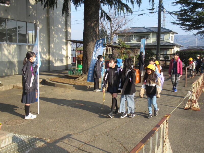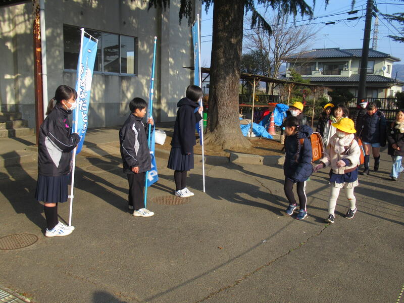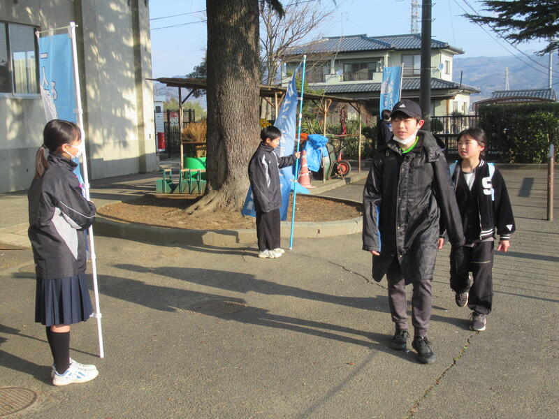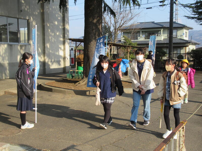 本校を卒業した北信中学校の先輩方が来て、のぼりを持ち、あいさつを呼びかけてくれました。