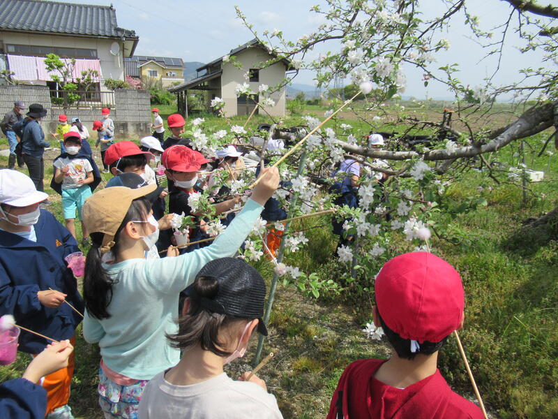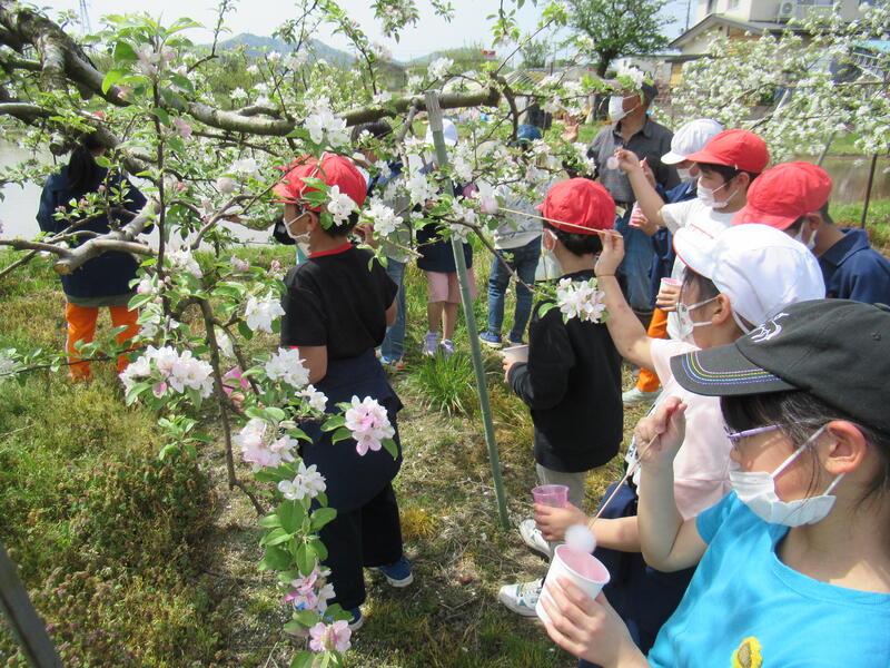 大きなリンゴが実ることを願いながら受粉を行いました。