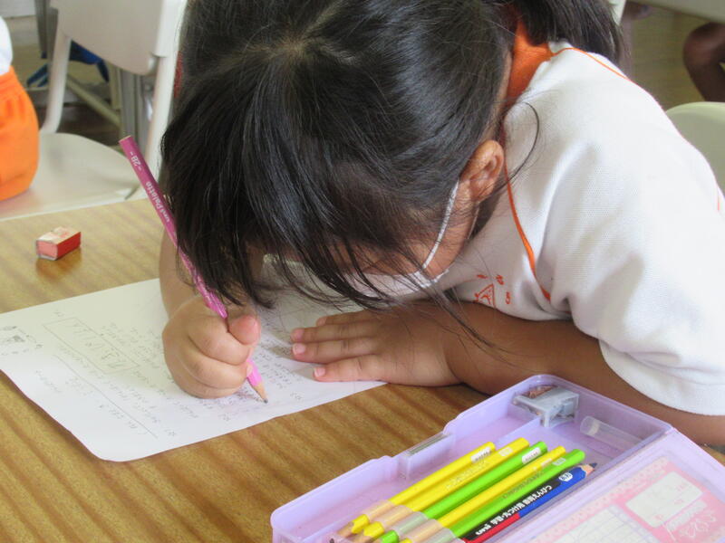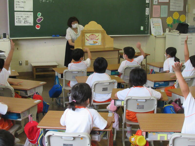 紙芝居を見たり、今日の給食の食材を考えたりして、