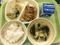 今日の給食のメニューは、ごはん、牛乳、厚揚げと野菜のそぼろ炒め、春雨サラダ、わかめと卵のスープでした。