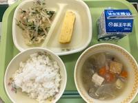 2020年6月8日 14時05分今日の給食のメニューは、ごはん、牛乳、厚焼き玉子、大根と水菜のあえもの、根菜のみそ汁でした。そして、今日のカミカミ食材は、根菜のみそ汁のごぼうやれんこんでした。