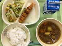 2020年7月30日 15時31分今日の給食のメニューは、ごはん、牛乳、セレクト献立(A:えびフライ B:チーズハムカツ)、コーンサラダ、スープカレーでした。