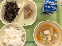 今日の給食のメニューは、ごはん、牛乳、鶏肉のみそ焼き、ひじきの炒め煮、キャベツと豆腐のみそ汁でした。