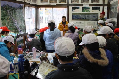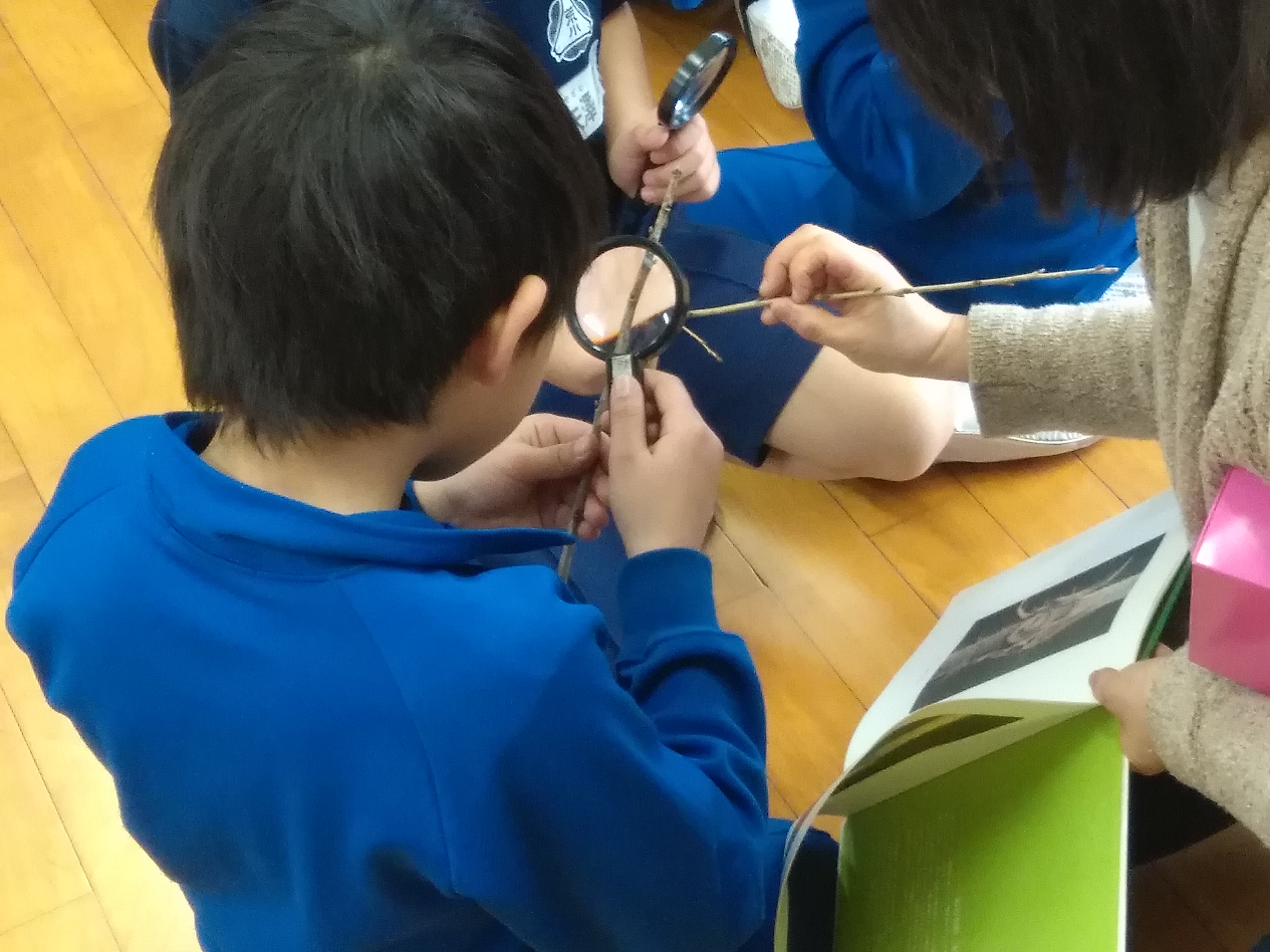 今回のテーマは「春は出会いがいっぱい」、春にまつわる絵本もたくさん紹介していただきました。また、実際に春を待つ木の芽やふきのとうを見せていただくと子供たちは大喜び、大歓声でわれもわれもとのぞきこんでいました。