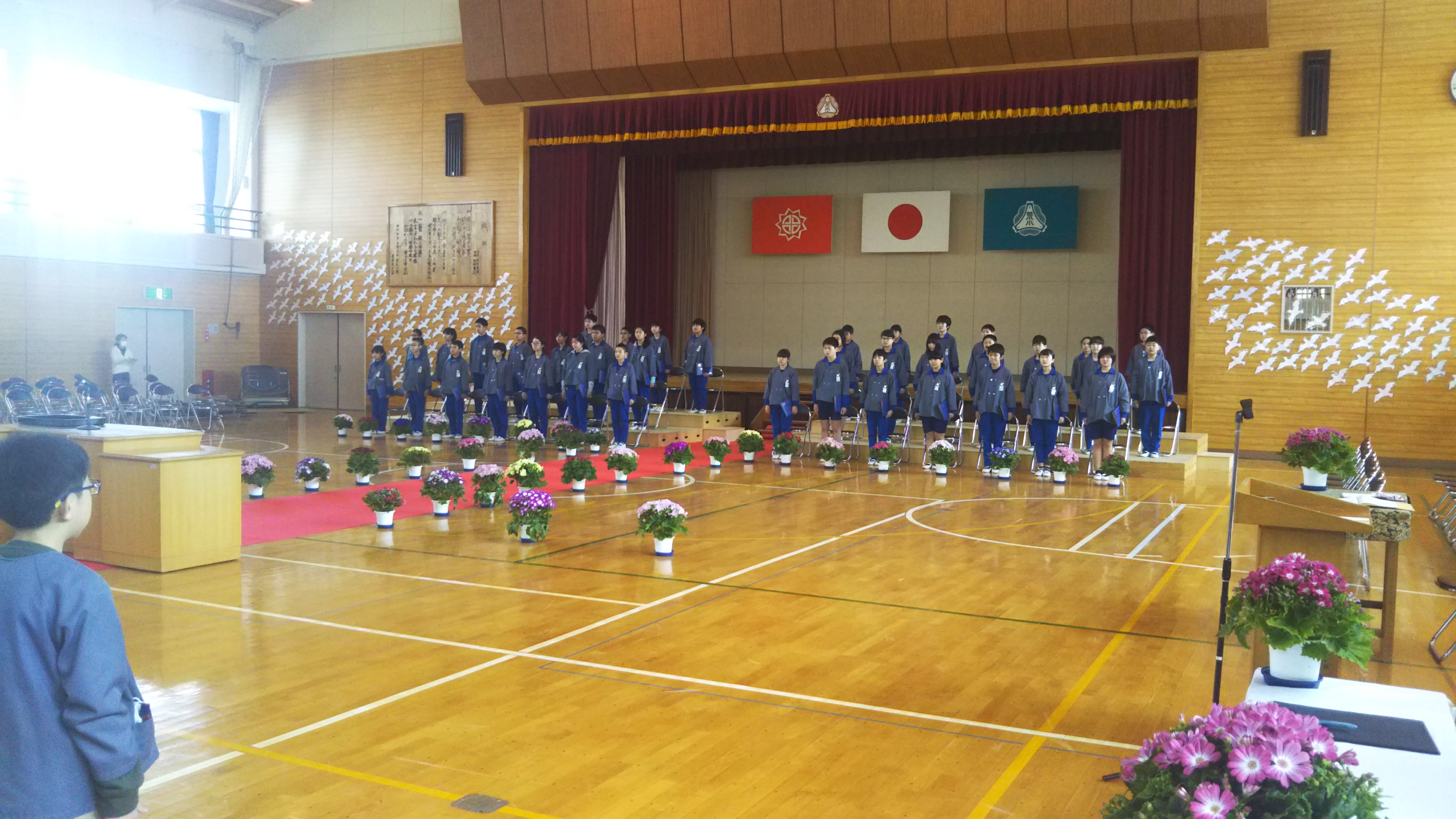 39人の卒業生は、胸を張って入場し、一人一人の卒業証書授与もとても堂々としていました。「別れの言葉」では、呼びかけも、歌も、しっかりと声が出ていて、会場の体育館に響き渡り、心にしみる仕上がりです。これまで丁寧に練習してきたことが十分に感じられました。