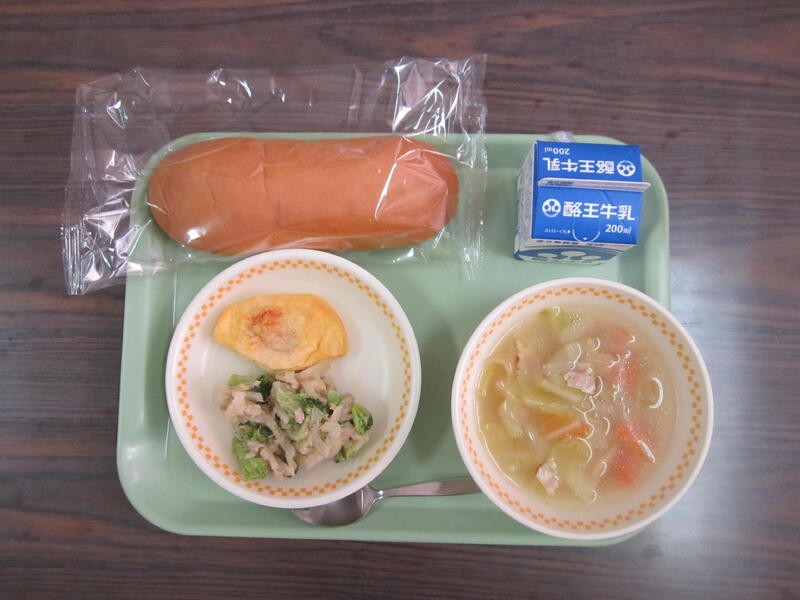 コッペパン トマトミートオムレツ 冬野菜のツナサラダ コンソメスープ です。おいしくいただきました。