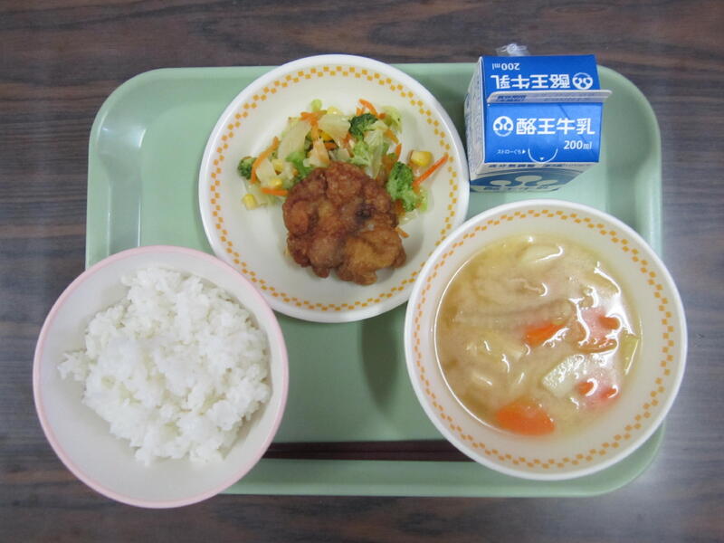 ごはん 鶏のから揚げレモンソースかけ ブロッコリーサラダ 野菜のかす汁 です。おいしくいただきました。