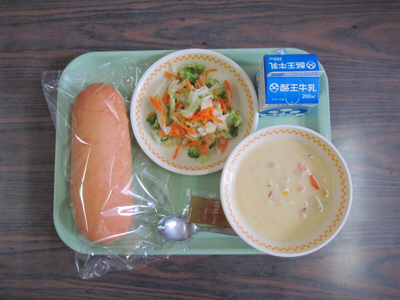 コッペパン フレンチサラダ コーンポタージュ ももジャム です。おいしくいただきました。