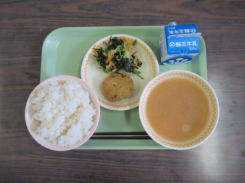 ごはん なめこ汁 県産鶏肉の青じそつくね キャベツの塩昆布和え です。おいしくいただきました。