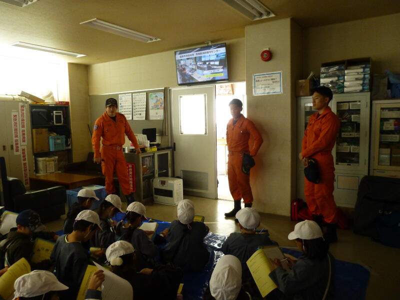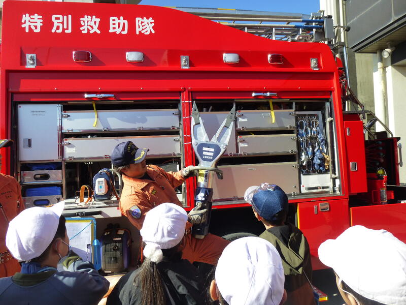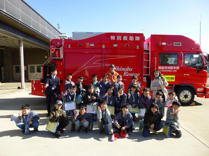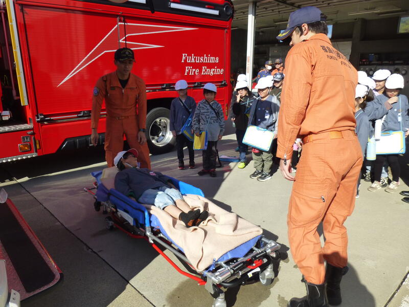 午前中は「福島消防署信夫分署」です。消防隊員の方から、消防士の仕事や、消防車、救急車の仕組みを見せてもらったり、実際にストレッチャーに乗って救急車の中に入ったりといろいろな体験を行う事ができました。