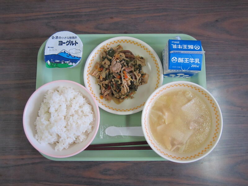 ごはん 県産豚肉のビビンバ 県産米粉ワンタンのスープ ヨーグルト です。おいしくいただきました。