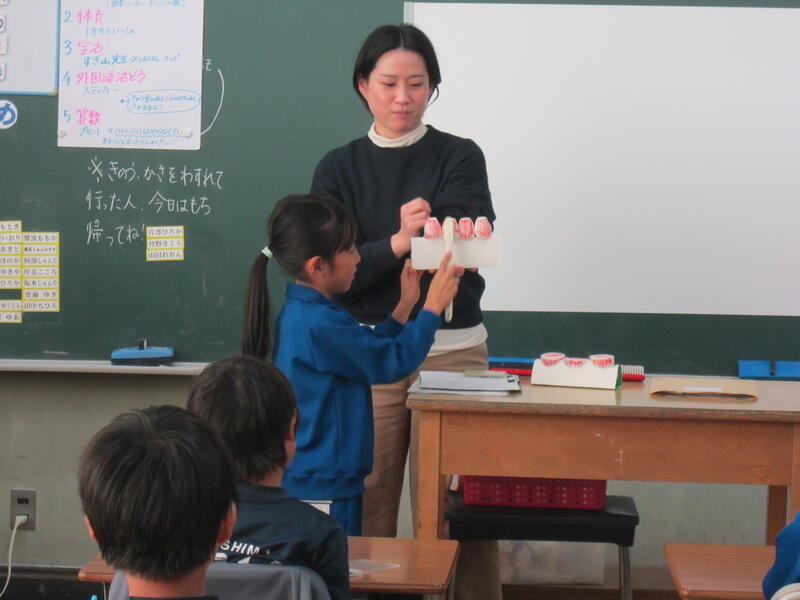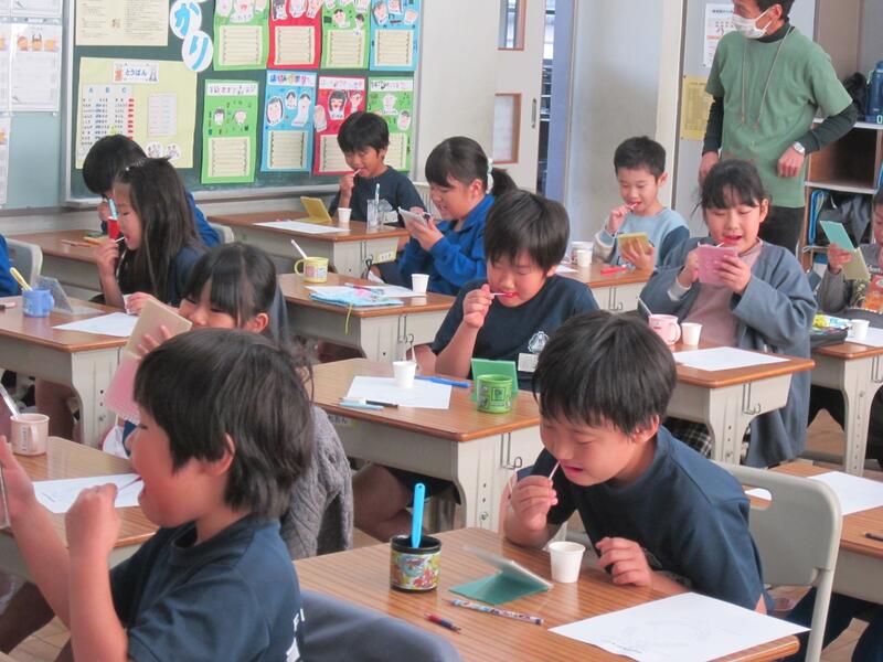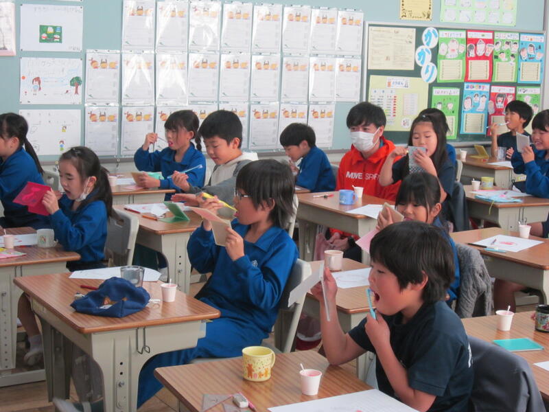 2年生は、3校時に保健室の先生と歯みがきの勉強をしました。前歯と奥歯では、磨き方が違うこと、磨いたつもりでも磨き残しがたくさんあることを知り、どのように磨けばきれいになるかを、歯を染め出して実際にやってみました。きれいになるまで5分以上かかりました。これからも時間をかけて丁寧に磨けるといいですね。