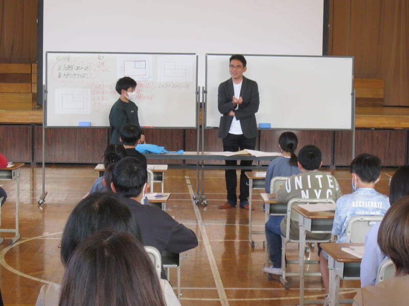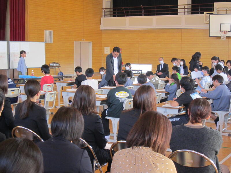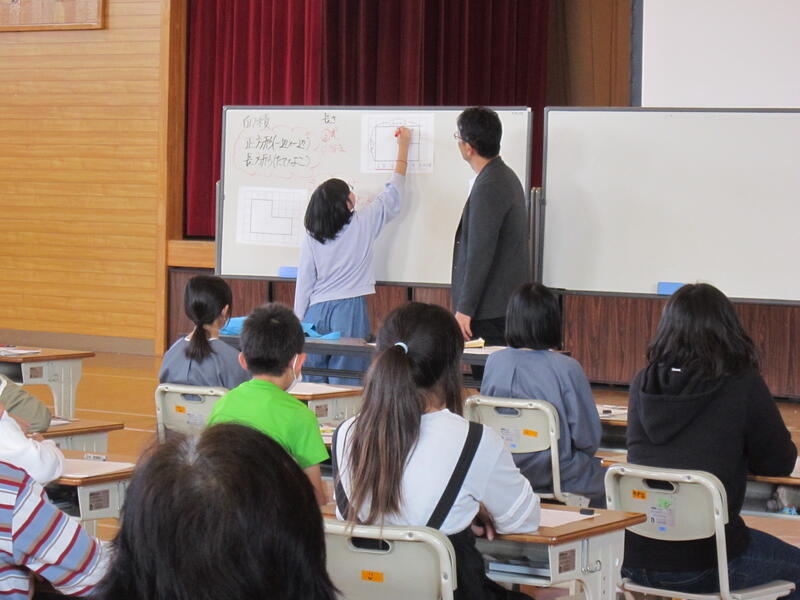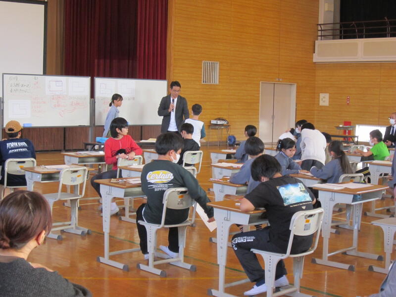 算数科研究会では、東京学芸大学附属小金井小学校の加固希支男先生をお招きし、本校5年生の子どもたちに、師範授業を行っていただきました。加固先生は、現在算数科において、全国でもトップランナーと言われる先生です。単元は「四角形と三角形の面積」の1時間目。加固先生の授業を参観するために、100名あまりの先生方が集まり、教室では入りきれないため、体育館で行いました。子どもたちはいつもとは違う環境でも、加固先生の話をしっかり聞きのびのびと学習に取り組むことができました。