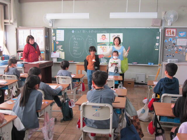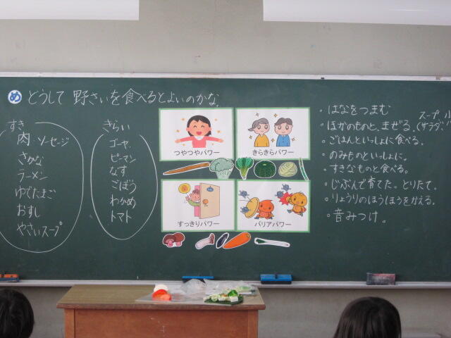 本日、栄養士の山口先生をお招きし、2年生と3年生に「栄養教室」を行っていただきました。2年生は「どうして野菜を食べるとよいのかな?」というテーマでした。好き嫌いが多い野菜について、食べるとどんないいことがあるのかを、イラストを見ながらわかりやすく教えていただきました。本日の授業をきっかけに少しでも野菜を食べることができるようになるといいですね。