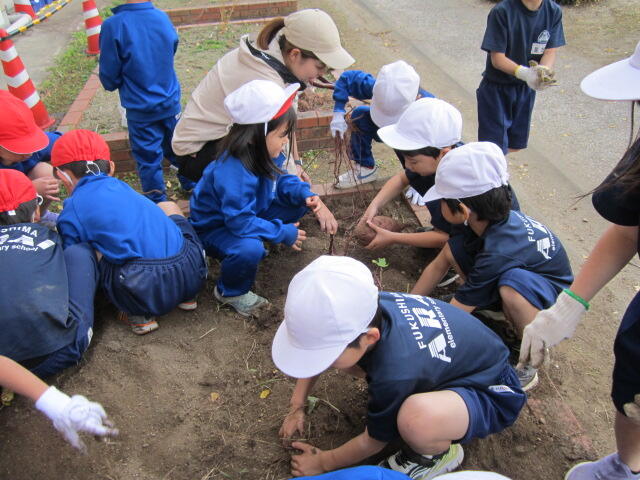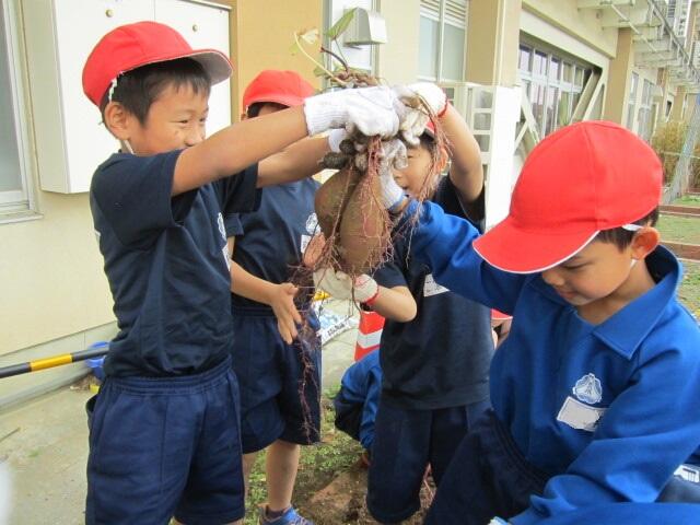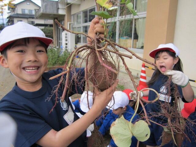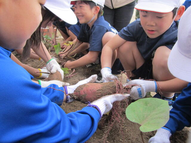 本日、1年生のこどもたちは、春に植えたさつまいもを掘りました。みんなで掘ると、おっきなさつまいもが出てくる出てくる。子どもたちも大喜び!今年も豊作でしたね!さあ、どうやって食べようね。