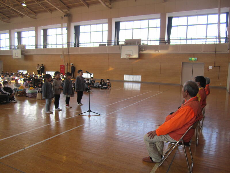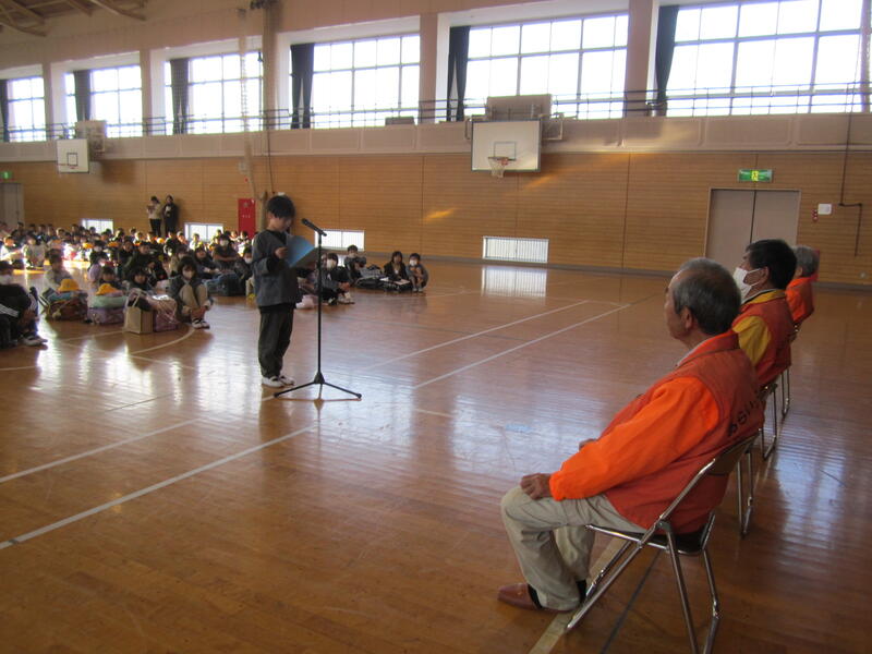 5校時終了後、いつも子どもたちの登下校を見守っていくださっている見守り隊を代表して4名の方をお迎えし、体育館で「見守り隊感謝の会」が行われました。1年生と6年生がお礼の言葉を述べ、、最後に見守り隊の代表の方から「感謝の気持ちをもつこと」「体調を崩さないように気をつけること」この2つのお話がありました。最後に通学班に分かれて一斉下校を行いました。これからも交通事故には十分気をつけて安全に登下校しましょう。
