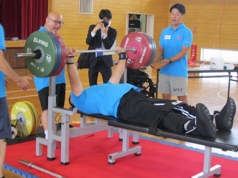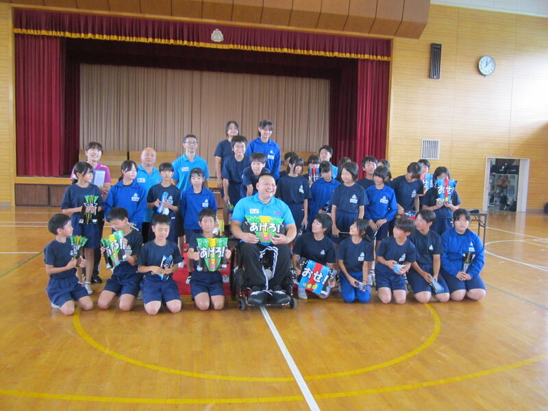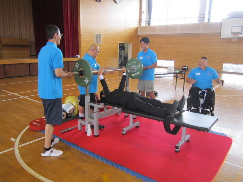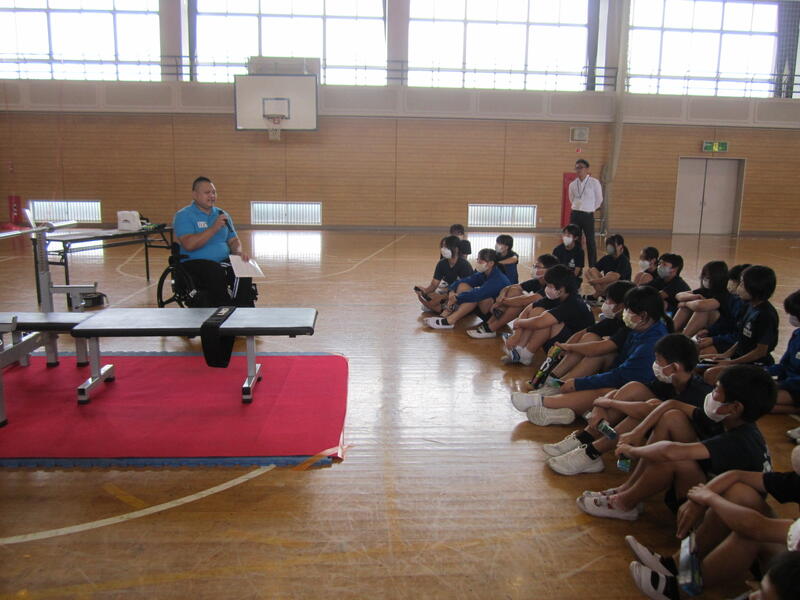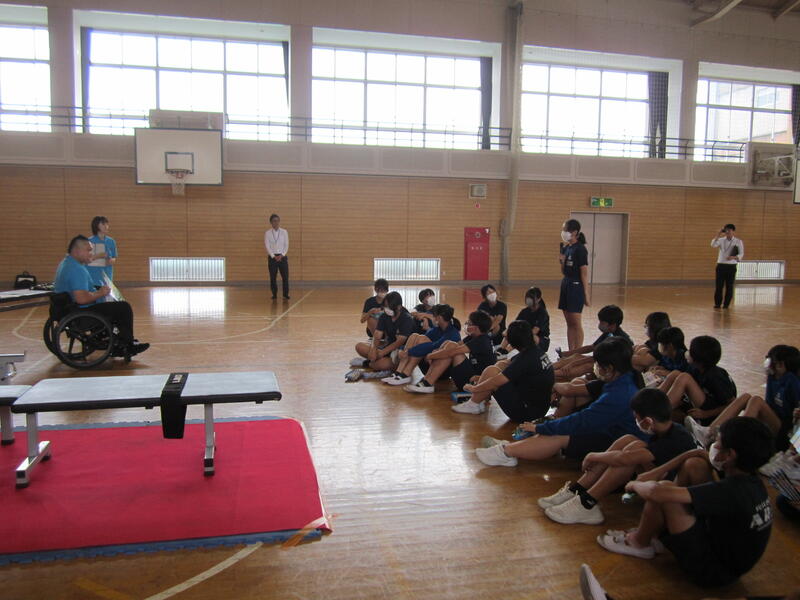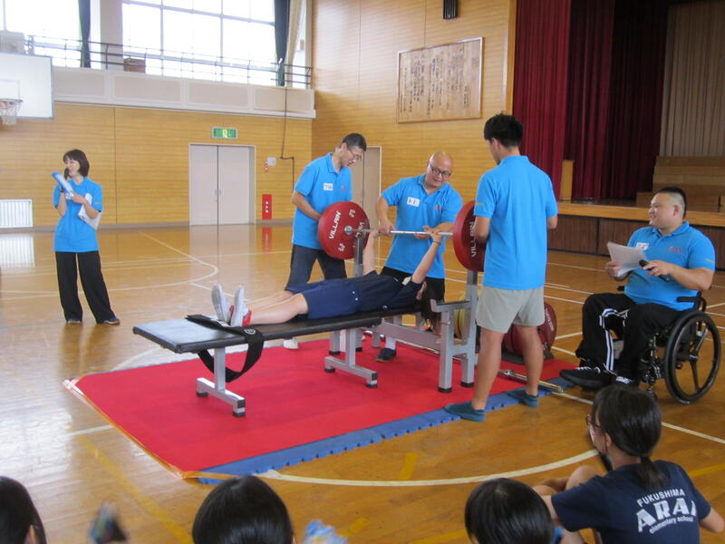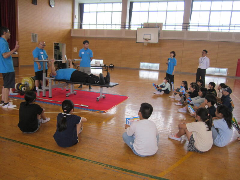 今日は「パラ・パワーリフティング」という種目で活躍している渡邉和幸選手をお招きして、3・6年生の子どもたちとの交流会を行いました。この種目は、通常のベンチプレスとは異なり、台上に全身を乗せ、腕の力だけでバーベルを持ち上げます。渡邉選手は、この日150kgのバーベルを子どもたちの前で持ち上げ、その怪力に子どもたちは大歓声!その後、全員がパラ・パワーリフティングに挑戦。一人一人挑戦する度に子どもたちの応援の声が体育館に響きわたりました。