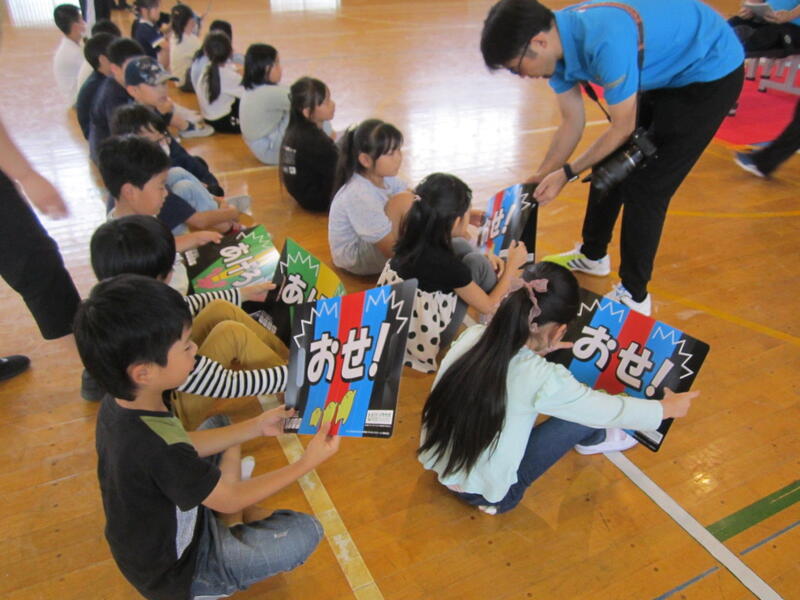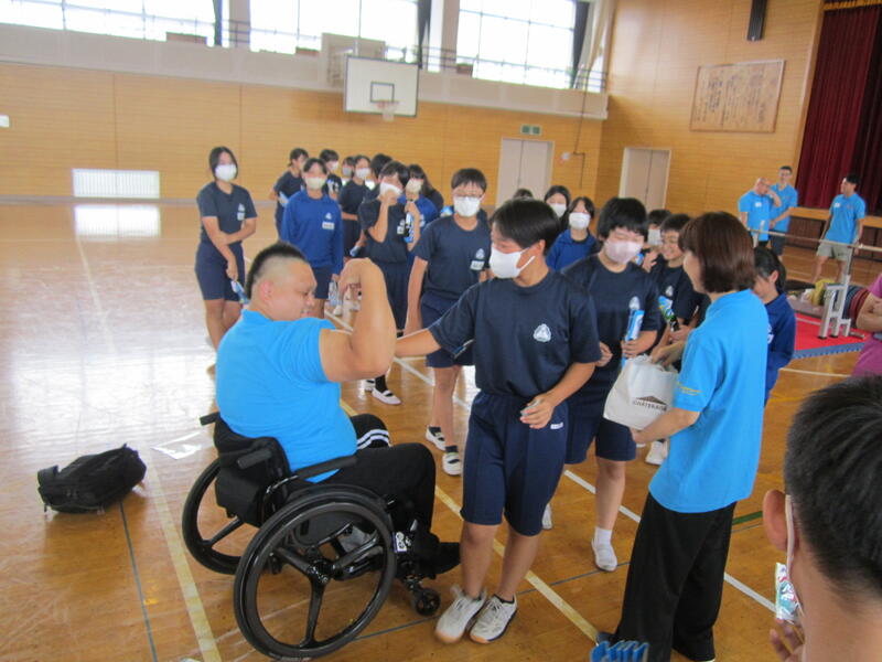 最後に記念撮影と、渡邉選手からバッチのプレゼントをもらい、子どもたちは大喜び。さらに、渡邉選手の力こぶを触らせてもらいました。その太さと硬さにまたまた驚きの大歓声!パラ・パワーリフティング選手の肉体のすごさを改めて感じていました。