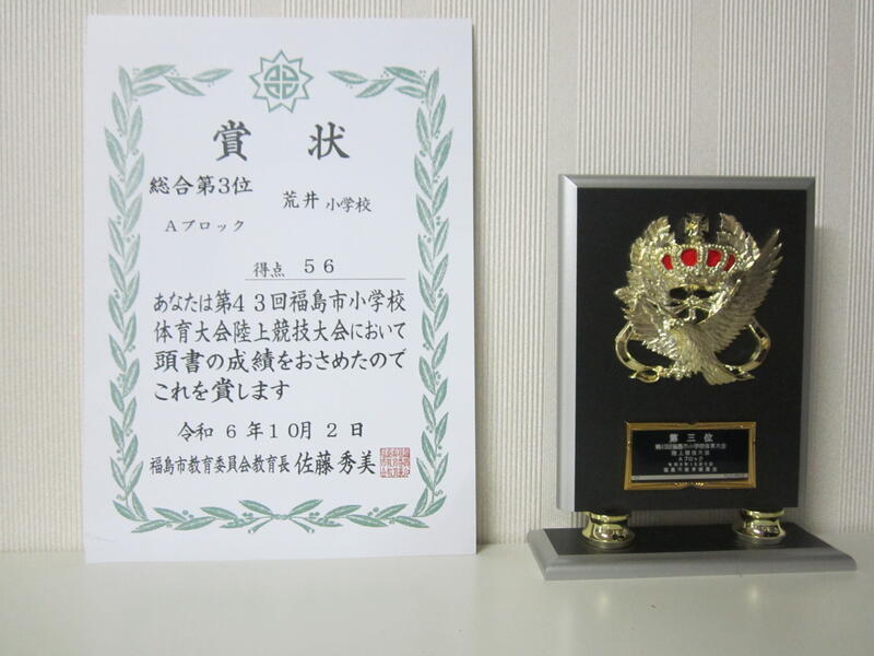 第43回福島市小学校体育大会陸上競技大会が「誠電社WINDYスタジアム」で行われました。青空が広がり、季節外れの高い気温の中、6年生のあらいっ子たちは、今までの練習の成果を十二分に発揮して、各種目で優勝者、入賞者に荒井小の名前を刻みました。その結果、見事Aブロック「総合3位」!素晴らしい成績です。